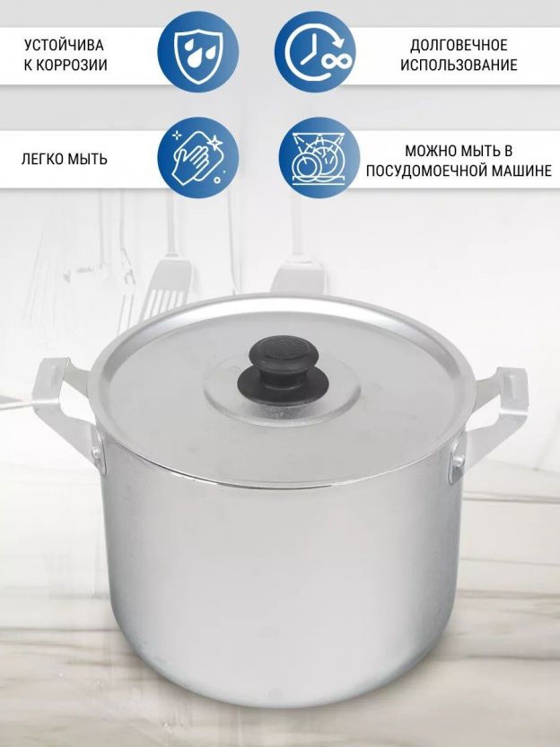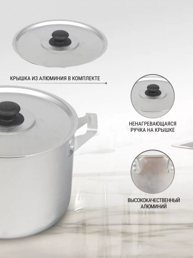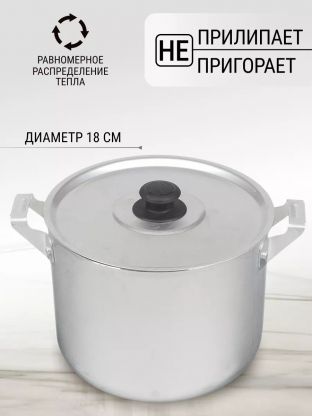 Кастрюля алюминий 3.5 л Калитва — выбор тех, кто ищет недорогую кастрюлю для дачи, дома или небольшой кухни. Лёгкий алюминиевый корпус быстро распределяет тепло, что особенно удобно при варке супов, макарон, пельменей. Отсутствие антипригарного и эмалированного покрытия облегчает уход — кастрюлю можно мыть в посудомоечной машине. Крышка также выполнена из алюминия, что делает конструкцию полностью пригодной для интенсивного использования.