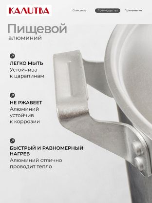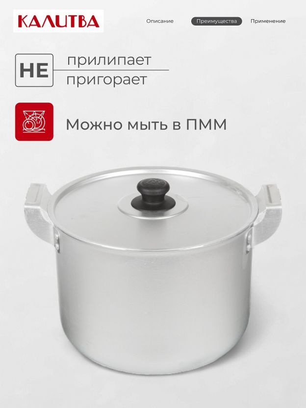Если сравнивать с эмалированными или многослойными аналогами, кастрюля Калитва легче, быстрее нагревается, но не имеет антипригарного покрытия. Это отличный вариант для тех, кто ищет простую и долговечную посуду без лишних функций. Как выбрать объём? 8 литров — оптимально для больших семей, для заготовок или приготовления на несколько дней. Можно ли мыть в посудомоечной машине — да, алюминий не боится частого мытья и прост в уходе.