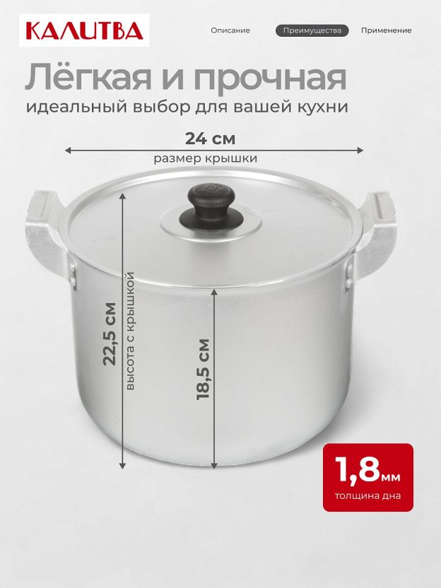 Кастрюля Калитва 8 л — идеальный вариант: вместимость позволяет готовить супы, компоты или макароны сразу на несколько порций, а лёгкий вес облегчает использование на даче и дома.