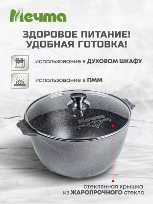 Если вы ищете, какую кастрюлю выбрать для большой семьи или для дачи, обратите внимание на алюминиевую кастрюлю «Мечта Гранит» 10 л. Благодаря толстому дну и прочному алюминию она быстро прогревается и медленно остывает, что удобно для варки супов, приготовления плова, макарон, каш и пельменей. Антипригарное покрытие на основе гранита предотвращает пригорание, а стеклянная крышка с выпускным клапаном сохраняет вкус и аромат блюд.