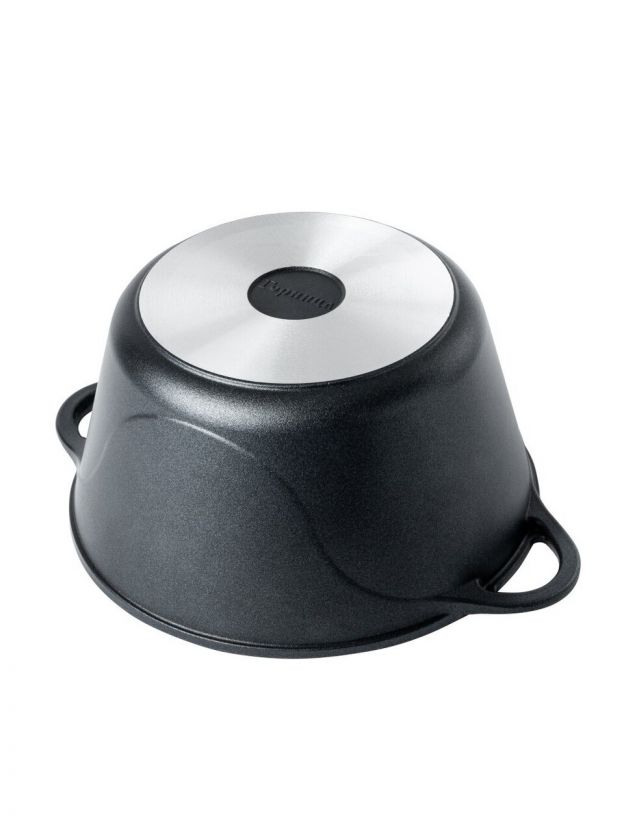 Объём — 2 литра, диаметр 22 см, диаметр дна 15,5 см, высота с крышкой 18,5 см, вес 1,7 кг.