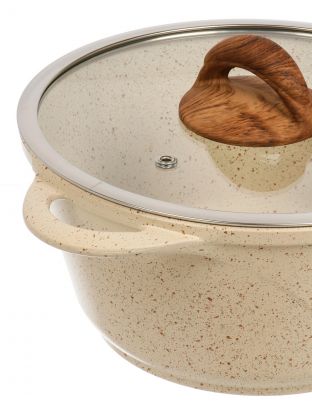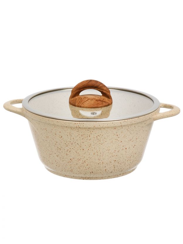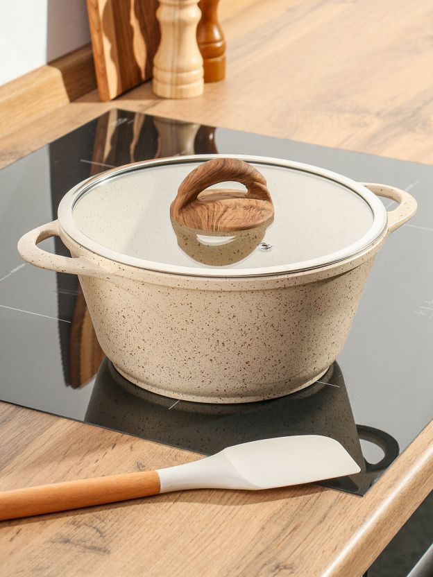Кастрюля алюминиевая с антипригарным мраморным покрытием Гурман Estima 2 л — это современное решение для тех, кто ищет, какую кастрюлю выбрать для индукционной плиты или универсального использования. Благодаря толстому дну (5,5 мм) и прочному корпусу из алюминия, тепло распределяется равномерно, что позволяет готовить блюда без пригорания и с минимальным добавлением масла. Покрытие не содержит вредных примесей, а стеклянная крышка с клапаном выпуска пара облегчает контроль за процессом приготовления.