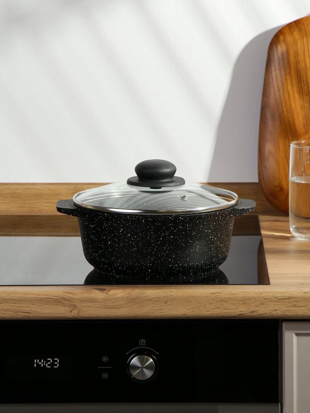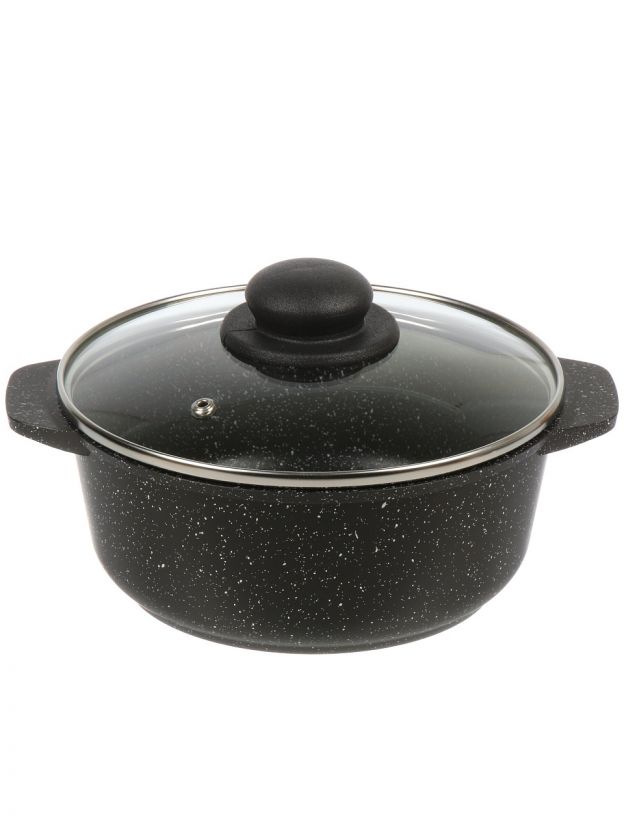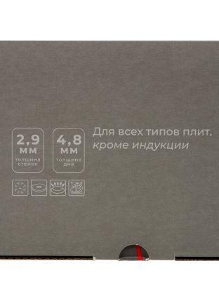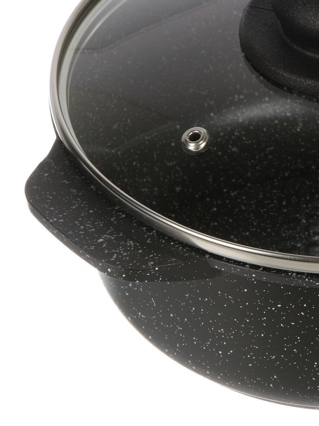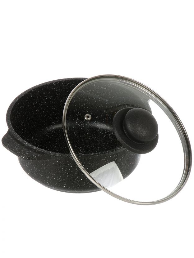 Объём — 2 литра, форма — круглая, цвет — чёрный. Кастрюля оснащена стеклянной крышкой с выпускным клапаном, толщина дна — 4,8 мм.
