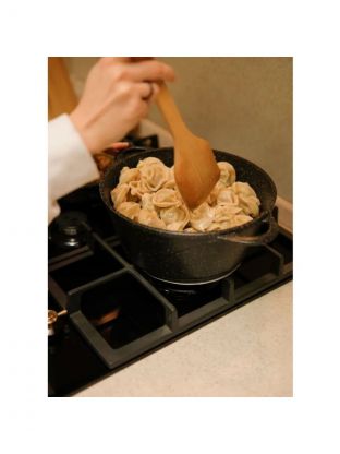 Благодаря антипригарному покрытию и толстому дну, кастрюля отлично подходит для приготовления риса, плова, пюре, пельменей, макарон и супов без риска пригорания.