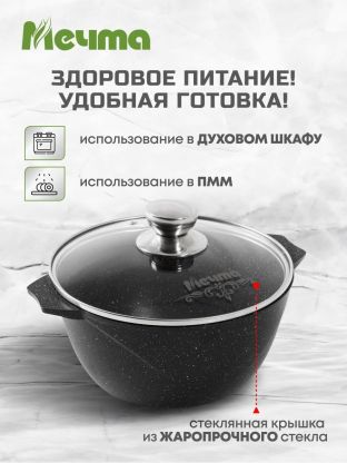 Многие спрашивают, подходит ли кастрюля для подарка или использования на даче. Благодаря универсальному дизайну, стильному чёрному цвету и удобству эксплуатации, эта модель станет отличным выбором для разных сценариев. Гарантия производителя — 12 месяцев, что подтверждает доверие к качеству бренда Мечта.