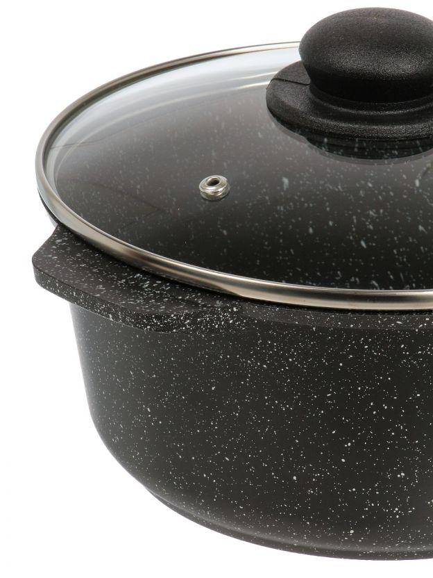 Гранитное антипригарное покрытие предотвращает пригорание, кастрюлю легко мыть, она не требует замачивания и устойчива к царапинам. Подходит для мытья в посудомоечной машине.