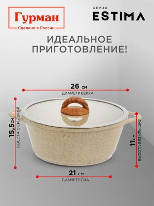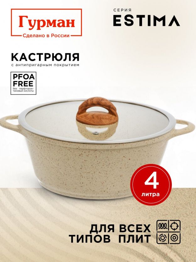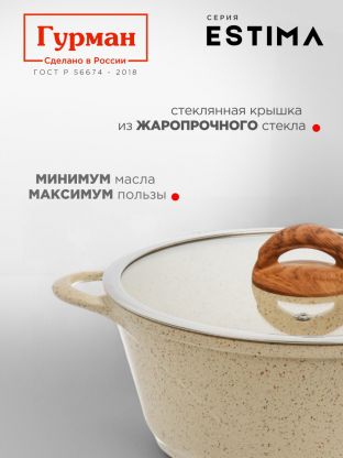 Кастрюля алюминий, антипригарное покрытие, 4 л, крышка стекло, Гурман, Estima, ГМк403 ЭБИ, бежевая, индукция