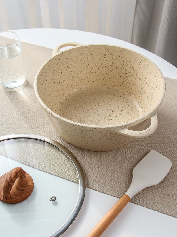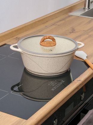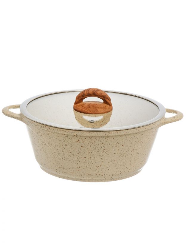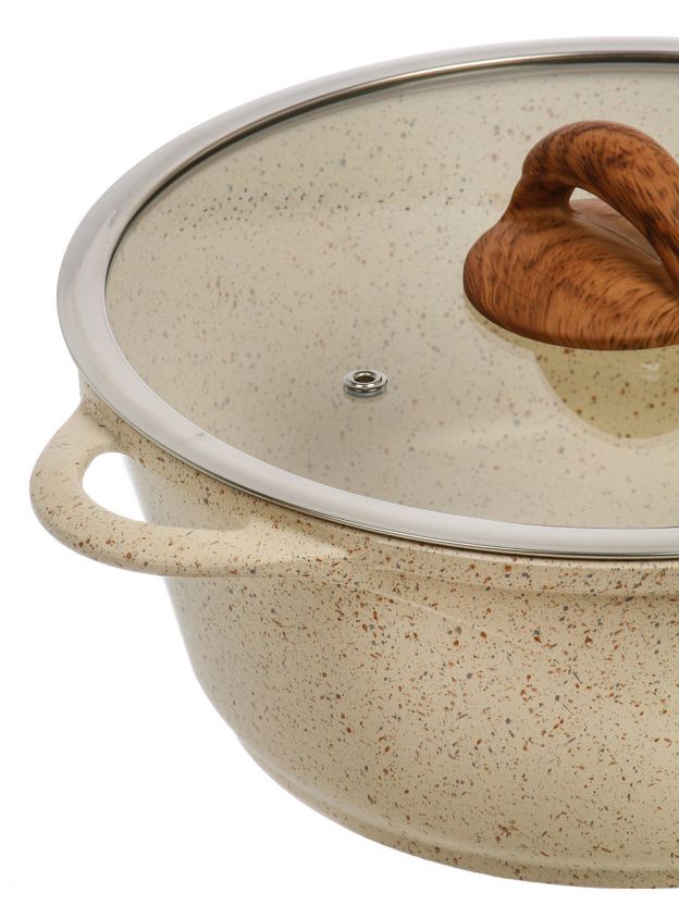 Кастрюля алюминиевая с антипригарным мраморным покрытием Estima объёмом 4 литра — это современное решение для ежедневной готовки. Благодаря толстому дну (4 мм) и прочным стенкам (3 мм), тепло распределяется равномерно, что исключает пригорание и обеспечивает идеальную текстуру блюд. Покрытие не впитывает запахи и не требует большого количества масла, что актуально для тех, кто ищет, какую кастрюлю выбрать для здорового питания. Стеклянная крышка с выпускным клапаном позволяет следить за процессом приготовления и предотвращает выкипание.