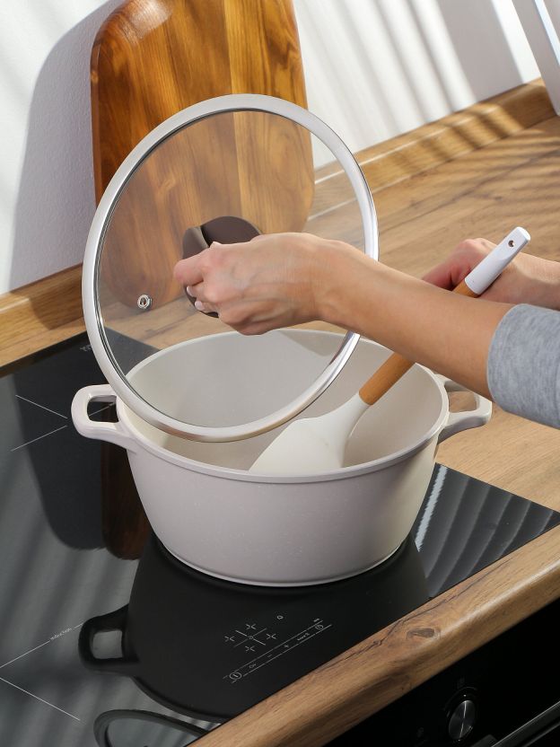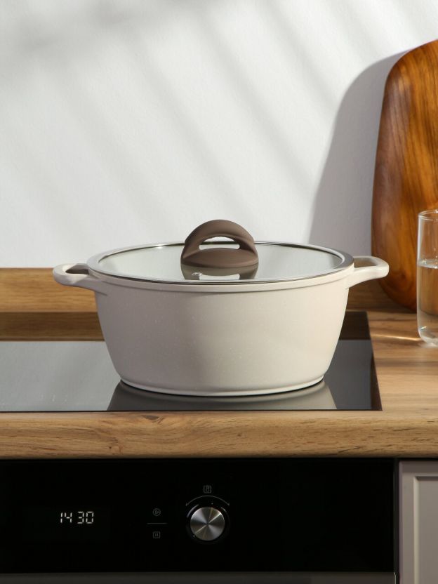 - Толстое дно 4,8 мм, легкий алюминий, объем 4 л — универсальное решение для любых плит, в том числе индукционных.