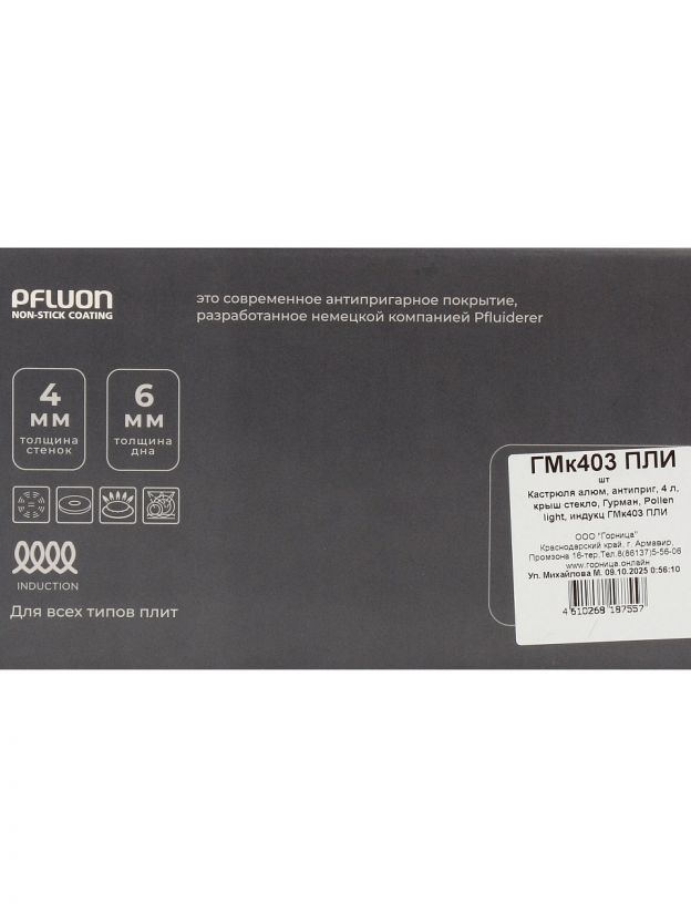 Кастрюля алюминий, антипригарное покрытие, 4 л, крышка стекло, Гурман, Pollen light, ГМк403 ПЛИ, индукция