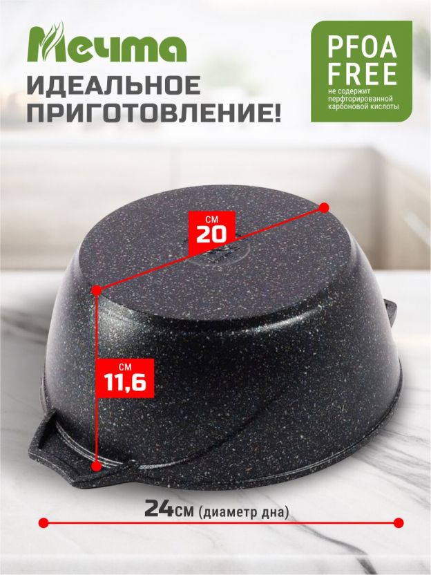 - Удобный размер 4 л, диаметр 24 см, толстое дно 7 мм — равномерный нагрев и сохранение тепла