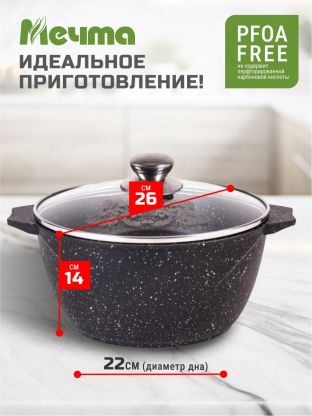 Если вы ищете, какую кастрюлю выбрать для семьи или дачи, обратите внимание на алюминиевую кастрюлю с антипригарным покрытием «Мечта Гранит black». Она сочетает лёгкость алюминия и прочность гранитного покрытия, что обеспечивает равномерный нагрев и предотвращает пригорание. Благодаря стеклянной крышке с выпускным клапаном удобно контролировать процесс приготовления — пар выходит, не создавая лишнего давления.