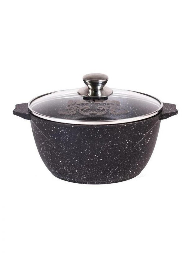 Кастрюля алюминиевая с антипригарным гранитным покрытием 5 л «Мечта Гранит black» — выбор для семьи: быстрое приготовление, стеклянная крышка, подходит для любых блюд.