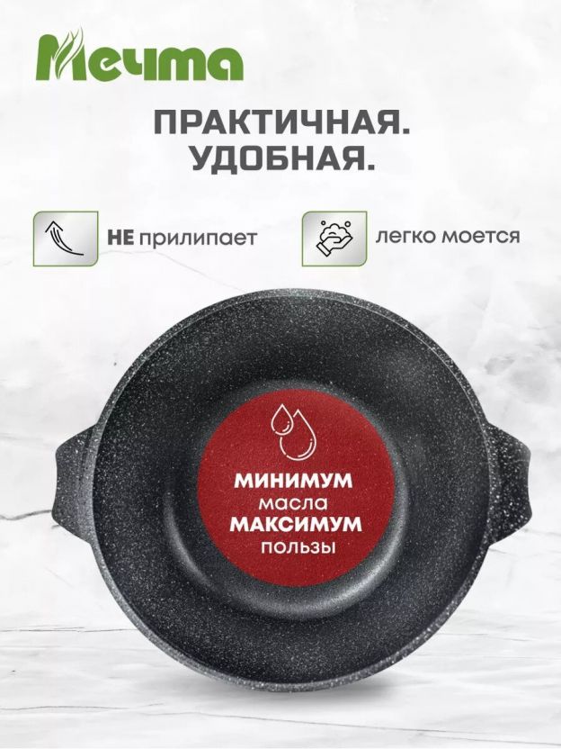 Кастрюля Мечта Гранит 8 л — ответ на вопрос «какую кастрюлю выбрать для большой семьи или праздничного застолья». Благодаря алюминиевому корпусу с толстым дном (6 мм) и инновационному гранитному антипригарному покрытию, еда не пригорает и не прилипает, что важно для приготовления каш, плова, супа или пельменей. В отличие от обычных эмалированных или стальных кастрюль, антипригарная поверхность позволяет готовить с минимальным количеством масла, а также легко отмывается в посудомоечной машине.