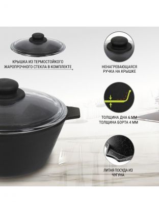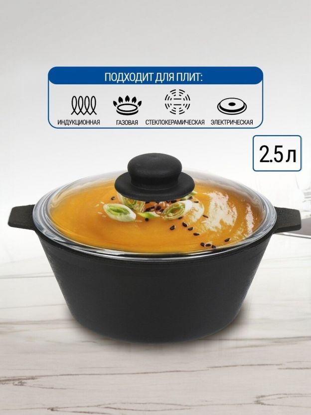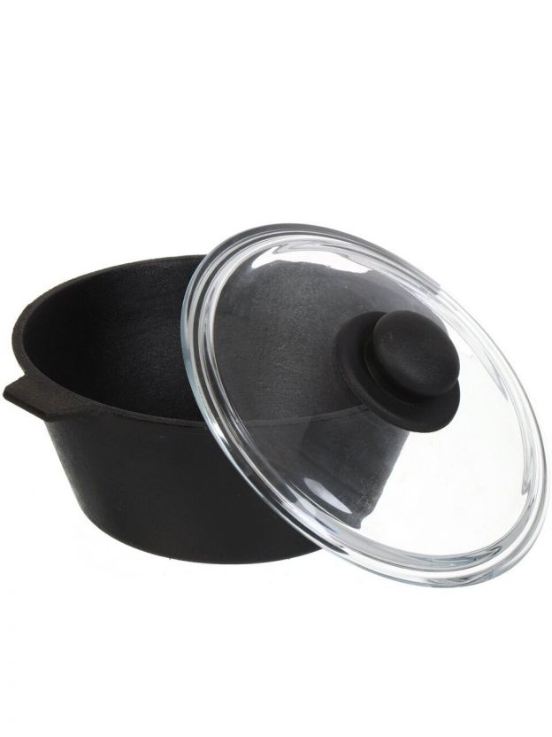 Чугунная кастрюля 2.5 л с крышкой из стекла для индукции — долговечность, идеальный объём и универсальность для домашней кухни и дачи.