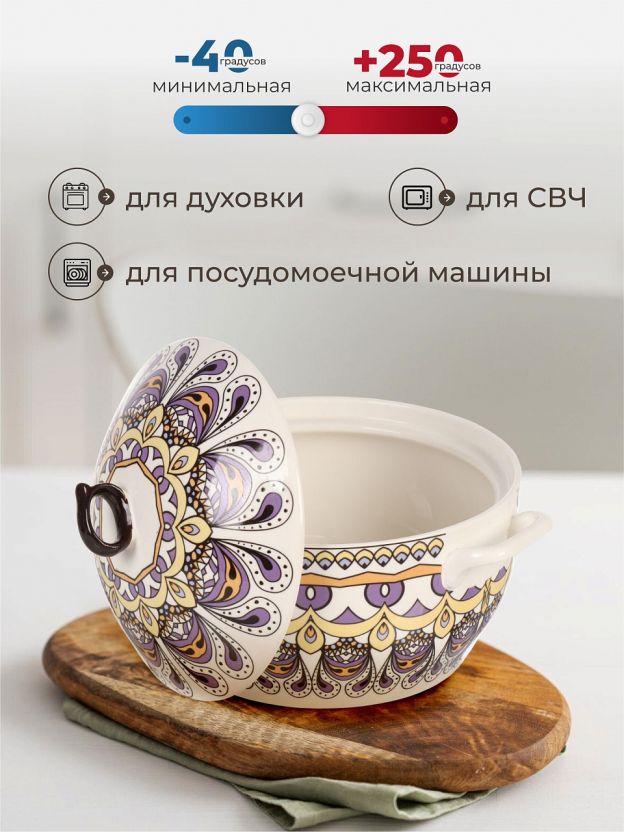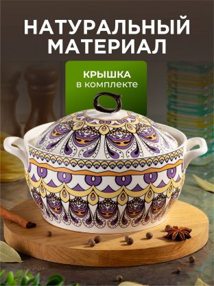 Керамическая кастрюля для запекания 1.6 л с крышкой: сохранение вкуса, универсальность для духовки и СВЧ, идеальный выбор для домашней кухни и подарка. Почему выбирают: Жаропрочная керамика сохраняет сочность и аромат блюд — идеально для запекания курицы и рыбы Оптимальный объём 1.6 л и диаметр 20 см — удобно готовить для семьи, подходит для СВЧ и духовки Эффектный восточный дизайн — уместно дома, на даче, как подарок ценителям керамики Кастрюля для запекания из коллекции Daniks Восток — это сочетание практичности и эстетики. Керамический корпус равномерно распределяет тепло, что позволяет готовить блюда без пересушивания и потери полезных свойств. Если вы ищете, какую кастрюлю выбрать для духовки или СВЧ, обратите внимание на данную модель: она не только выдерживает высокие температуры, но и легко очищается в посудомоечной машине. В отличие от металлических или стеклянных аналогов, керамика не вступает в реакцию с пищей и не впитывает запахи. Покупатели часто спрашивают, подходит ли эта кастрюля для повседневного использования и каковы её преимущества для дачи. Благодаря прочности и универсальности, она станет незаменимой для приготовления запеканок, рагу, рыбы, курицы и даже десертов. Крышка в комплекте сохраняет тепло и аромат, а разноцветный дизайн добавит уюта вашей кухне. Закажите керамическую кастрюлю для запекания с крышкой прямо сейчас — получите универсальную посуду для любых рецептов с выгодной доставкой и гарантией надежности. Частые вопросы: Можно ли использовать кастрюлю для запекания в микроволновке? Да, керамическая кастрюля Восток подходит для использования в СВЧ и духовке. Она выдерживает высокую температуру и не деформируется при нагреве. Чем керамическая кастрюля удобнее металлической? Керамика равномерно распределяет тепло, не влияет на вкус блюд, не ржавеет и не впитывает запахи. Её легко мыть в посудомоечной машине, что экономит время. Какой объём и размер у этой кастрюли? Объём — 1.6 литра, диаметр — 20 см, высота — 11 см. Это оптимальный размер для семьи из 2-4 человек или приготовления порционных блюд.