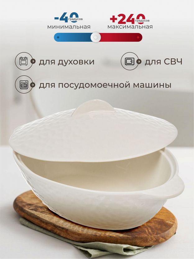 Овальная керамическая кастрюля для запекания 2 л с крышкой — идеальный выбор для домашней кухни и дачи. Готовьте сочное мясо и рыбу без лишнего масла, экономьте время и силы. Почему выбирают: Жаропрочная керамика — равномерное распределение тепла, блюда получаются нежными и ароматными Оптимальный размер 20x32x8,5 см (2 л) — удобно готовить для семьи, подходит для духовки и микроволновки Универсальность — отличное решение для дома, дачи, оригинального подарка или сервировки праздничного стола Кастрюля для запекания из коллекции Антарктида Y6 — это современная посуда для тех, кто ценит удобство и эстетику. Керамический корпус сохраняет тепло, не впитывает запахи и позволяет готовить без антипригарного покрытия. Благодаря овальной форме и объёму 2 литра, кастрюля идеально подходит для запекания курицы, рыбы, овощей, а также для приготовления запеканок и рагу. Часто спрашивают: «Как использовать керамическую кастрюлю в духовке?» — просто поместите продукт, накройте крышкой и готовьте при температуре до 250°C. В отличие от металлических аналогов, керамика не выделяет посторонних вкусов, а белый цвет добавляет свежести любой сервировке. Можно мыть в посудомоечной машине, использовать в СВЧ и духовке — это удобно для занятых людей и семей. Если вы ищете, какую кастрюлю выбрать для дачи или подарка — обратите внимание на жаропрочную керамику: она долговечна, устойчива к перепадам температур и проста в уходе. Выбирайте овальную керамическую кастрюлю с крышкой по выгодной цене — получите универсальный инструмент для запекания и сервировки, который прослужит долгие годы. Оформите заказ онлайн и оцените качество жаропрочной посуды для дома и дачи! Частые вопросы: Можно ли использовать керамическую кастрюлю Антарктида в микроволновке и духовке? Да, кастрюля подходит для использования в СВЧ и духовке, выдерживает высокие температуры, не деформируется и не трескается при правильном использовании. Чем керамика лучше других материалов для запекания? Керамика равномерно распределяет тепло, сохраняет сочность продуктов, не впитывает запахи, легко моется и не требует антипригарного покрытия, что делает её безопасной для здоровья. Какой размер и объём у кастрюли? Размер: 20x32x8,5 см, объём — 2 литра. Овальная форма и крышка в комплекте позволяют готовить разнообразные блюда для семьи или гостей.