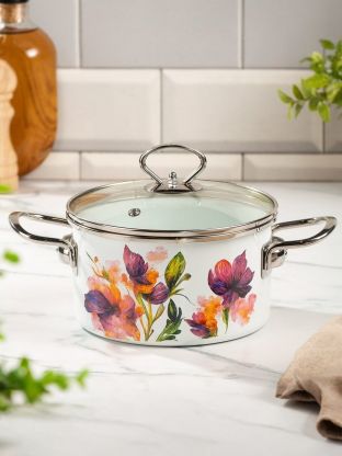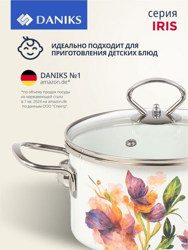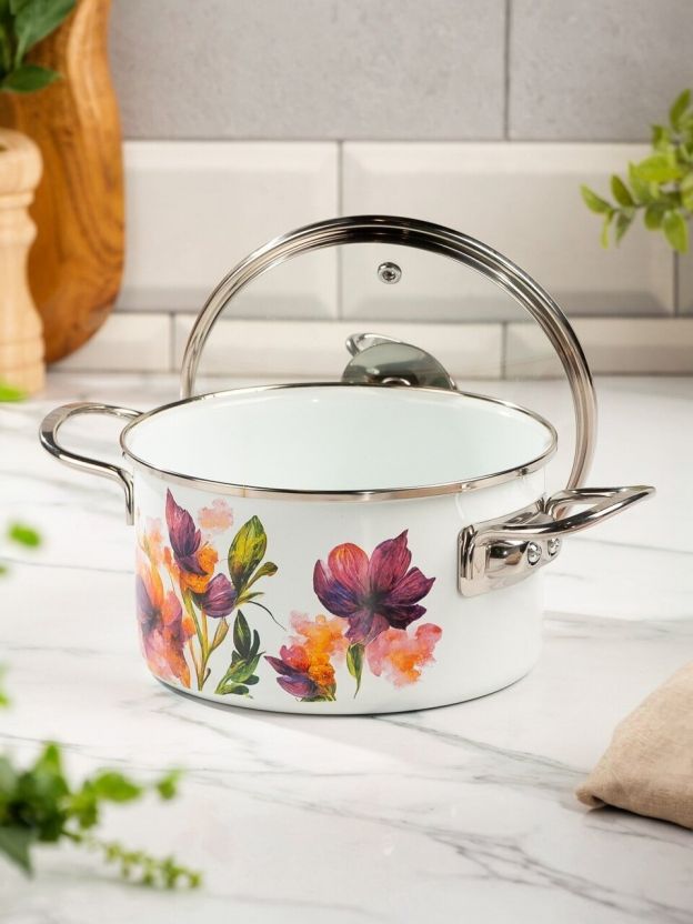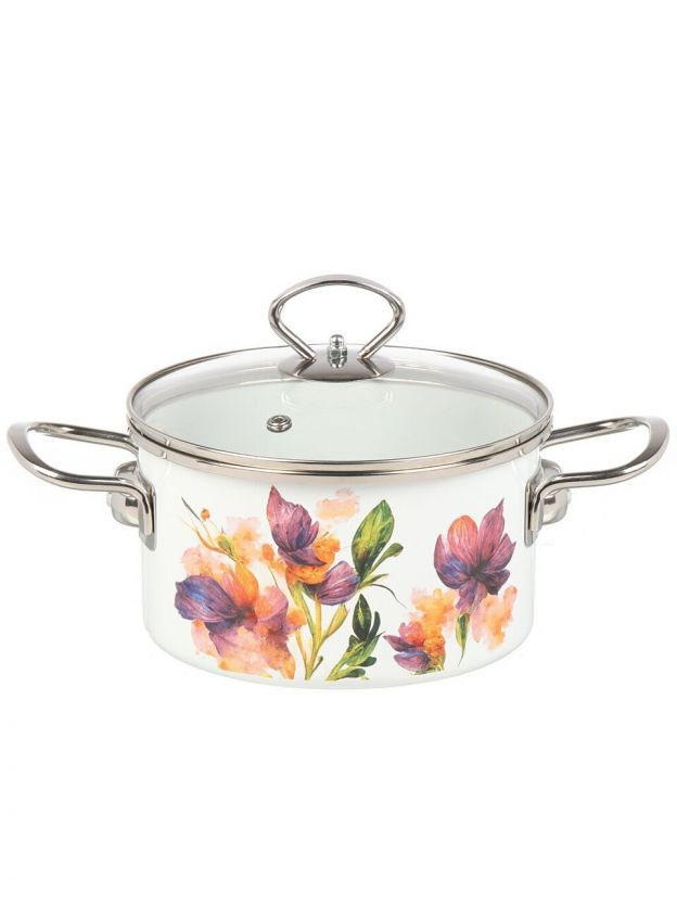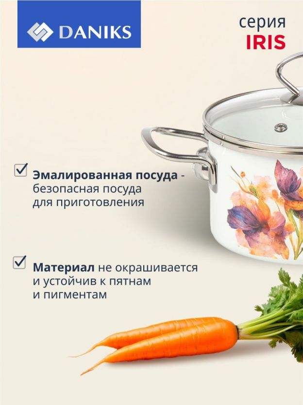 Кастрюля Daniks Iris 1.8 л с эмалированной сталью и стеклянной крышкой — оптимальный выбор для индукционных плит, дома и дачи: удобно, долговечно, безопасно.