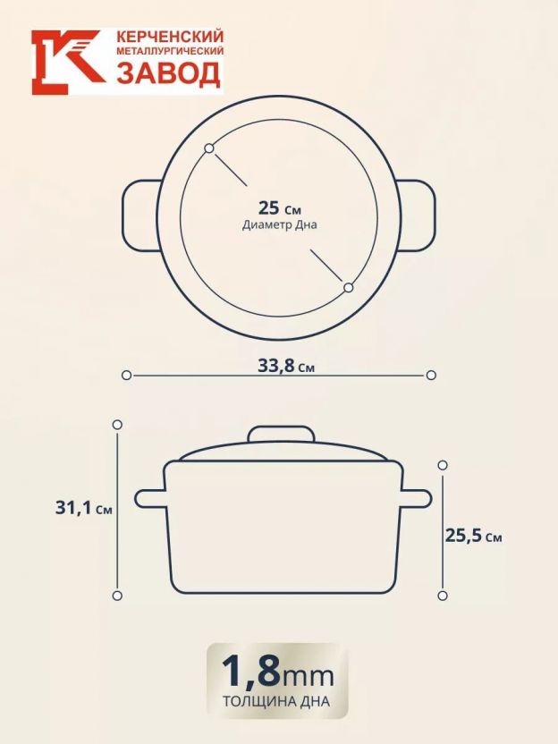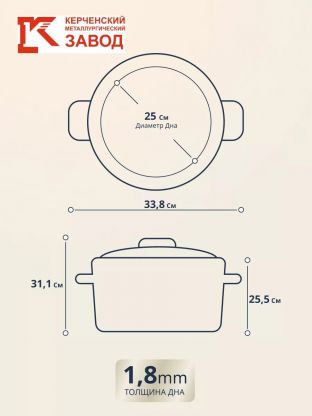 Диаметр и диаметр дна — 25 см, высота с крышкой — 31,1 см, без крышки — 25,5 см. Вес изделия — 2,2 кг, толщина дна — 1,8 мм.