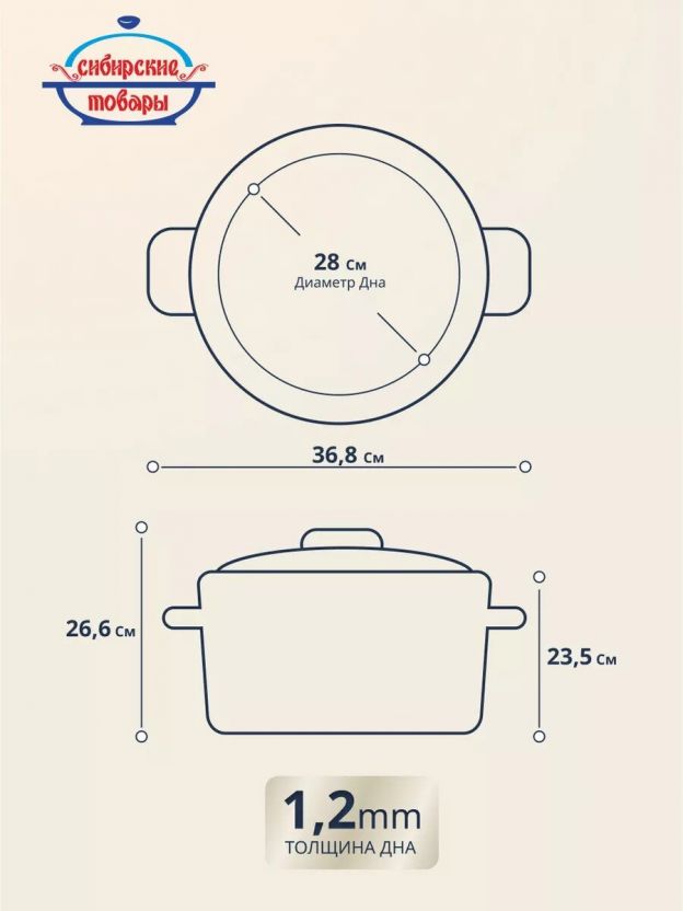 Кастрюля рассчитана на 14 литров (объём с шагом 0,5 — до 14,5 л), диаметр 28 см, подходит для приготовления на 8-12 человек.
