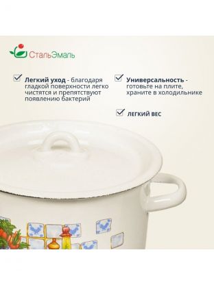 Эмалированная кастрюля объемом 2.9 литра от бренда СтальЭмаль — это сочетание практичности и универсальности. Благодаря цилиндрической форме и диаметру 18 см, она отлично подходит для приготовления супов, каш, гарниров и любых домашних блюд. Эмалированная сталь устойчива к коррозии, не впитывает запахи и легко очищается, что особенно важно для тех, кто ищет простоту ухода и долговечность. Если вы спрашиваете, какую кастрюлю выбрать для индукционной плиты или что лучше для дачи — этот вариант подойдет для всех популярных типов плит: газовых, электрических, стеклокерамических и индукционных.