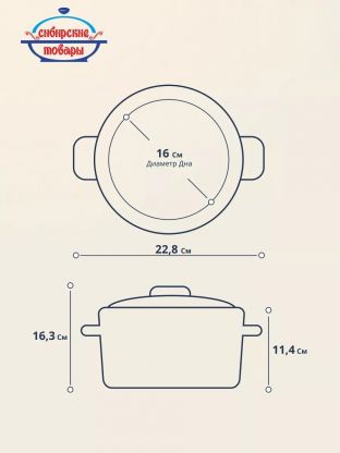 Объём — 2 литра, диаметр дна и крышки — 16 см, высота с крышкой — 16,3 см, без крышки — 11,4 см, толщина дна — 0,8 мм.