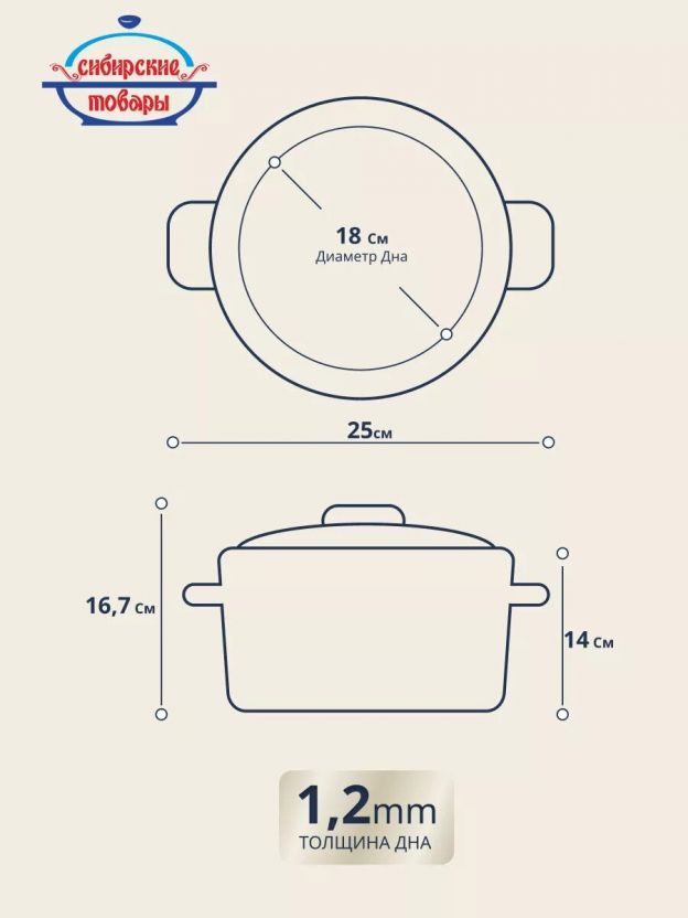 Объём 3.5 литра и диаметр 18 см подходят для приготовления обеда или ужина на небольшую семью. Высота без крышки — 14 см, с крышкой — 16.7 см.