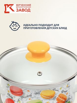 Кастрюля эмалированная сталь, 3 л, крышка стекло, цилиндрическая, Керченский металлургический завод, Цветное печенье, 42304-122/4.02-У4, белая