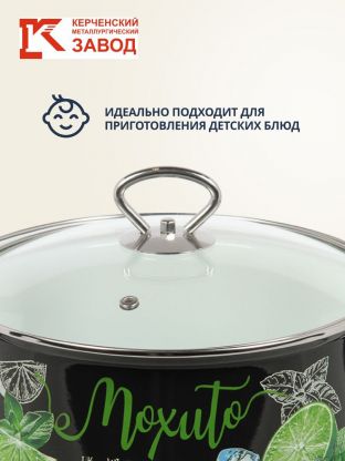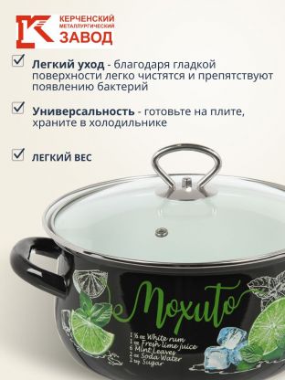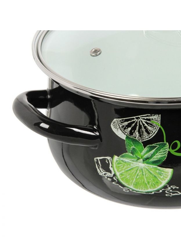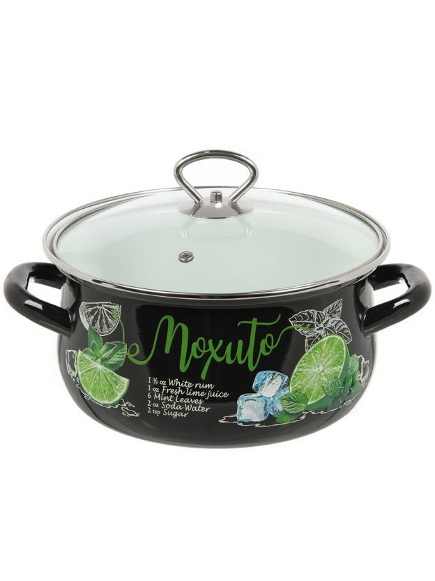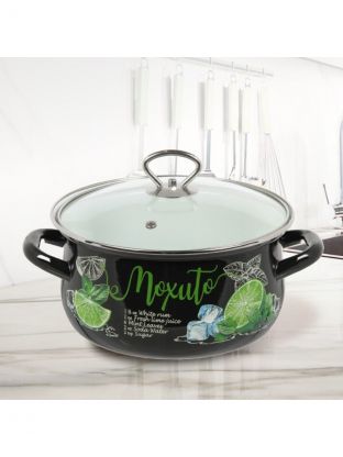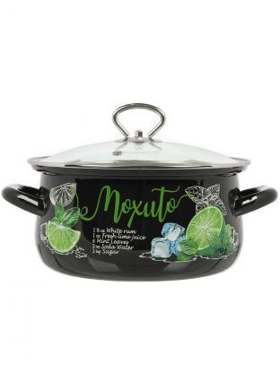 Кастрюля эмалированная 3 л с декором “Мохито” — универсальное решение для дома и дачи: долговечная сталь, стеклянная крышка, стильный дизайн.