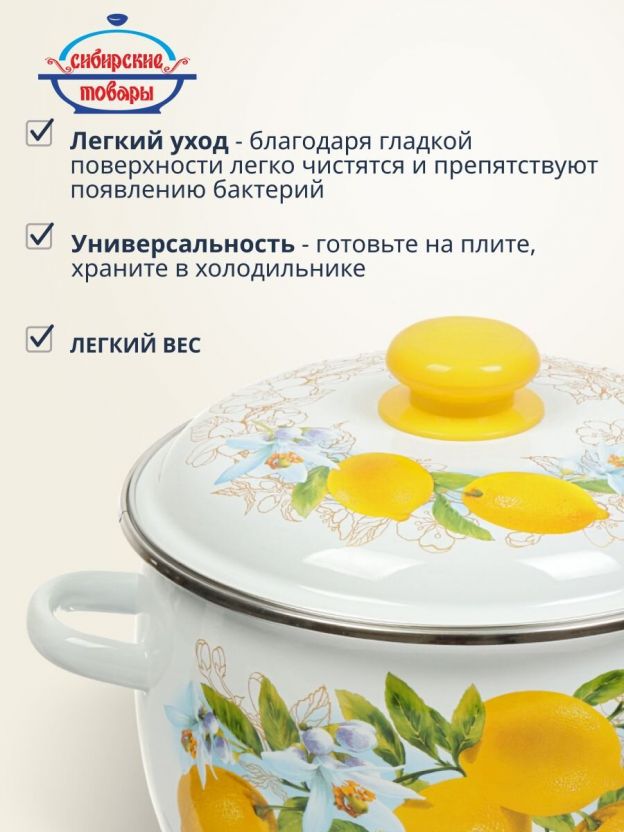 Подарите себе и близким надежную кастрюлю с гарантией производителя 24 месяца. Оформите заказ онлайн — выгодная цена и быстрая доставка по России. Кастрюля «Сибирские товары Лимоны» — ваш выбор для дома и дачи.