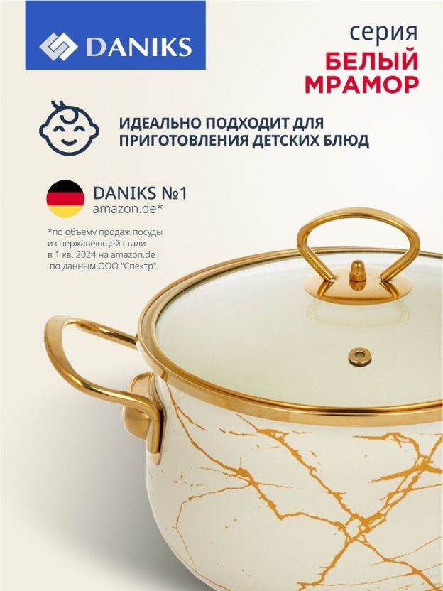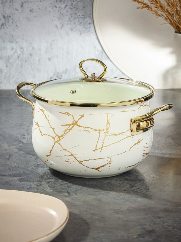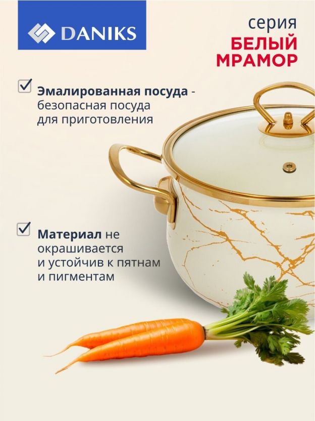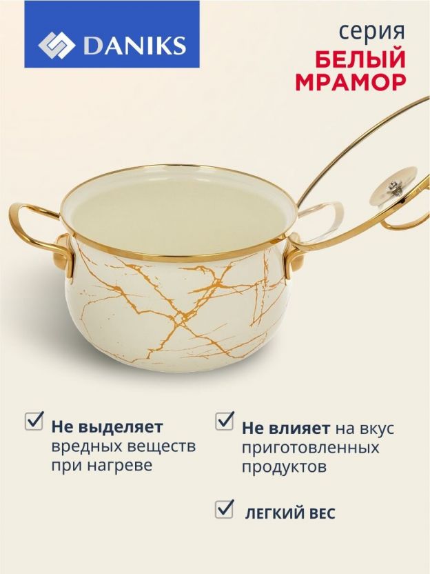 Кастрюля эмалированная Daniks 4 л с крышкой из стекла: стиль «Белый мрамор», подходит для индукции, универсальна для дома и дачи — выгодное решение для ежедневной готовки.