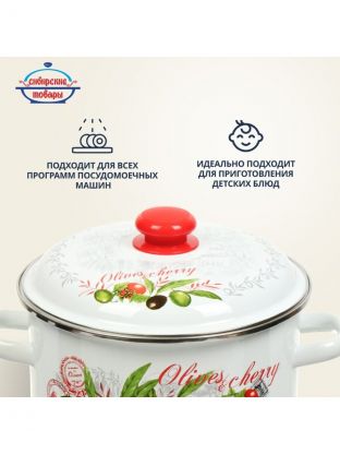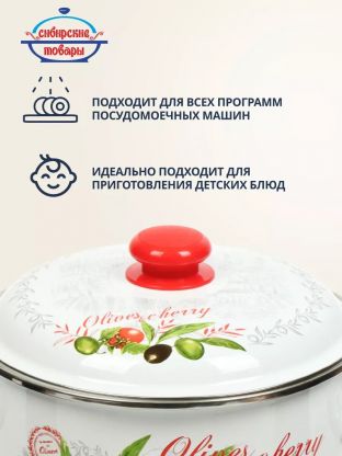 Кастрюля эмалированная сталь, 5.5 л, крышка сталь, цилиндрическая, Сибирские товары, Оливки и черри, 3MD221P, индукция