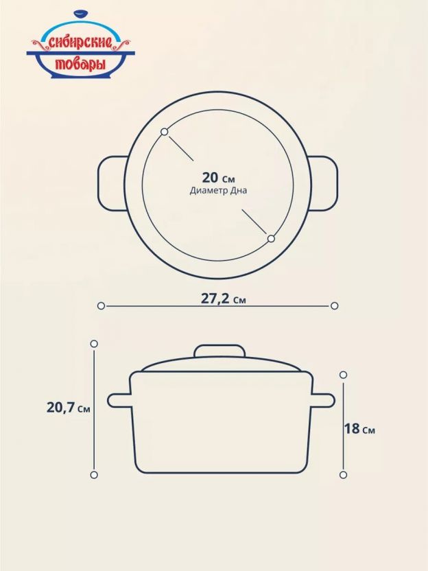 Объём кастрюли — 5.5 литра. Этого достаточно для приготовления супа, каши или пельменей на 4-6 человек. Диаметр дна и крышки — 20 см, высота без крышки — 18 см.