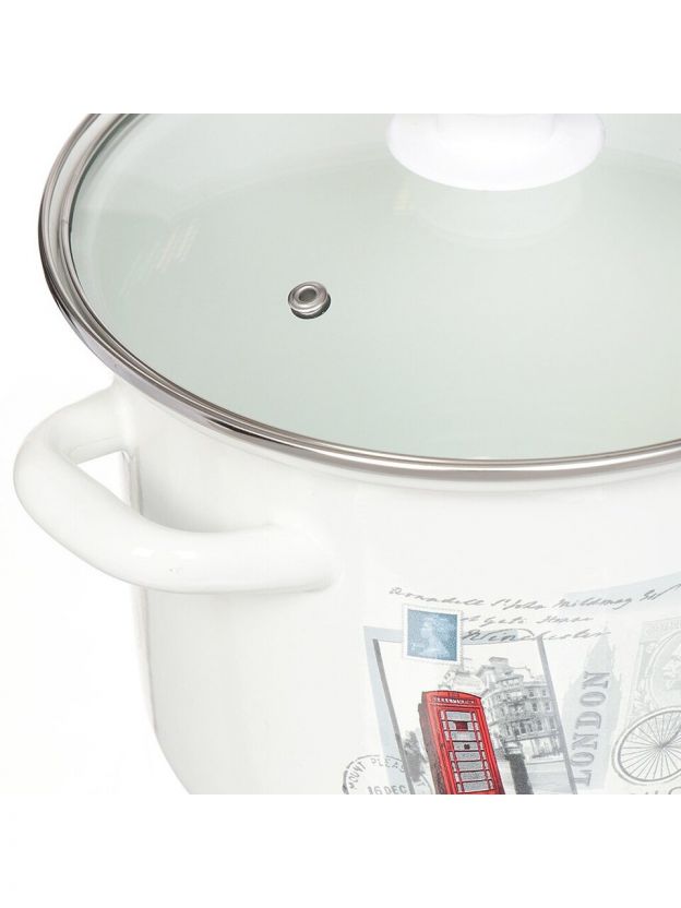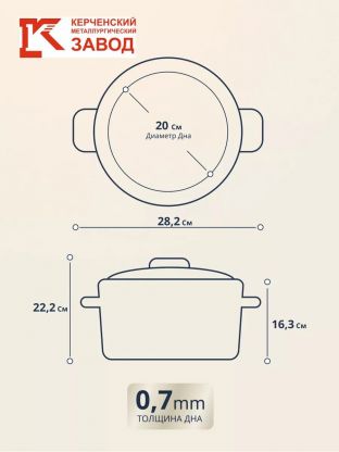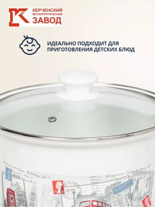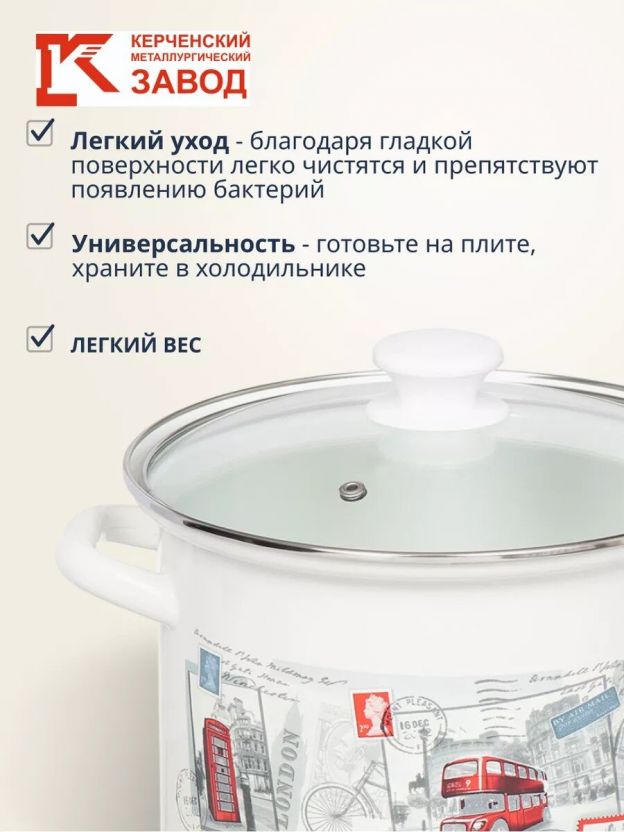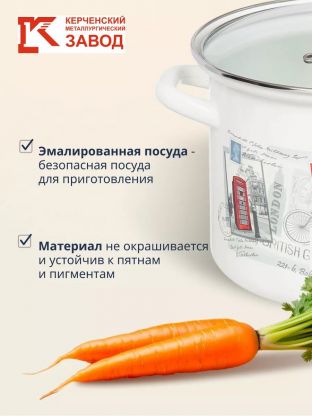Кастрюля эмалированная 5 л с прочной стеклянной крышкой от Керченского металлургического завода — оптимальный выбор для семьи: готовьте супы, каши, пельмени без хлопот.