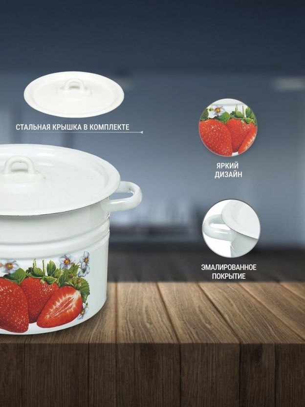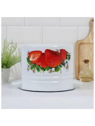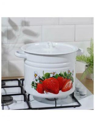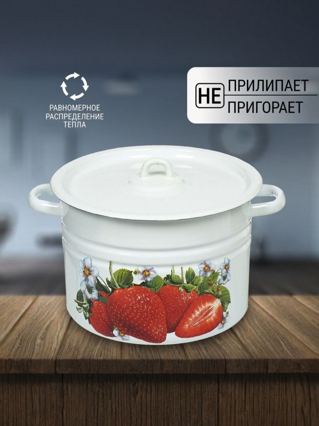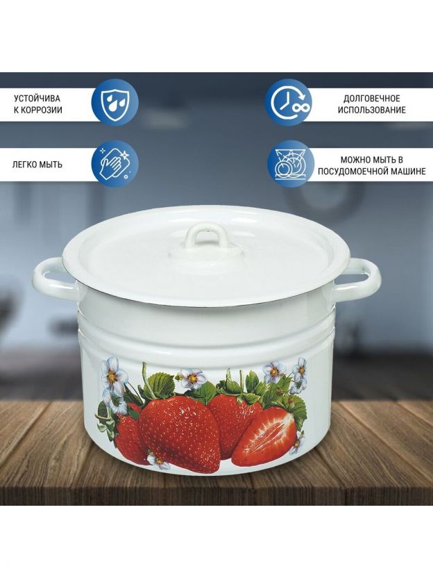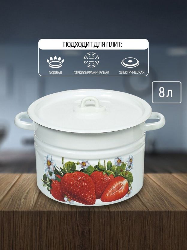Эмалированная кастрюля 8 л «Клубника садовая» — долговечная сталь, стильный дизайн, идеальный выбор для семьи и дачи по выгодной цене.