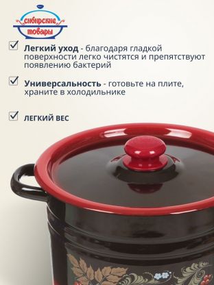 Кастрюля легко моется вручную, не требует особого ухода, не боится кислых блюд и отлично подходит для подарка или хозяйства. Благодаря прочной стальной крышке и классической форме, посуда прослужит долго и сохранит презентабельный вид. Для тех, кто ищет "что лучше для больших семей", этот объём и материал — надёжное решение.