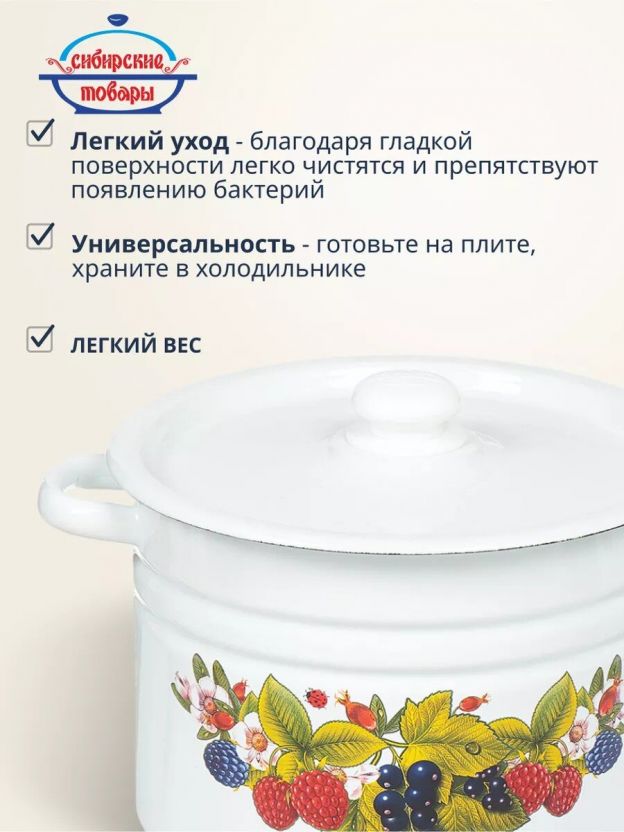 Кастрюля эмалированная 8 литров от бренда «Сибирские товары» — это практичный выбор для тех, кто ищет, какую кастрюлю выбрать для семьи или дачи. Благодаря цилиндрической форме и толстому дну (1,2 мм), тепло распределяется равномерно, что уменьшает риск пригорания. Стальная крышка надежно удерживает тепло и аромат блюд. Эмалированное покрытие не впитывает запахи и устойчиво к коррозии, что особенно важно для частого использования. Для тех, кто ищет, чем отличается эмалированная кастрюля от алюминиевой — сталь долговечнее, легче очищается и не вступает в реакцию с продуктами.