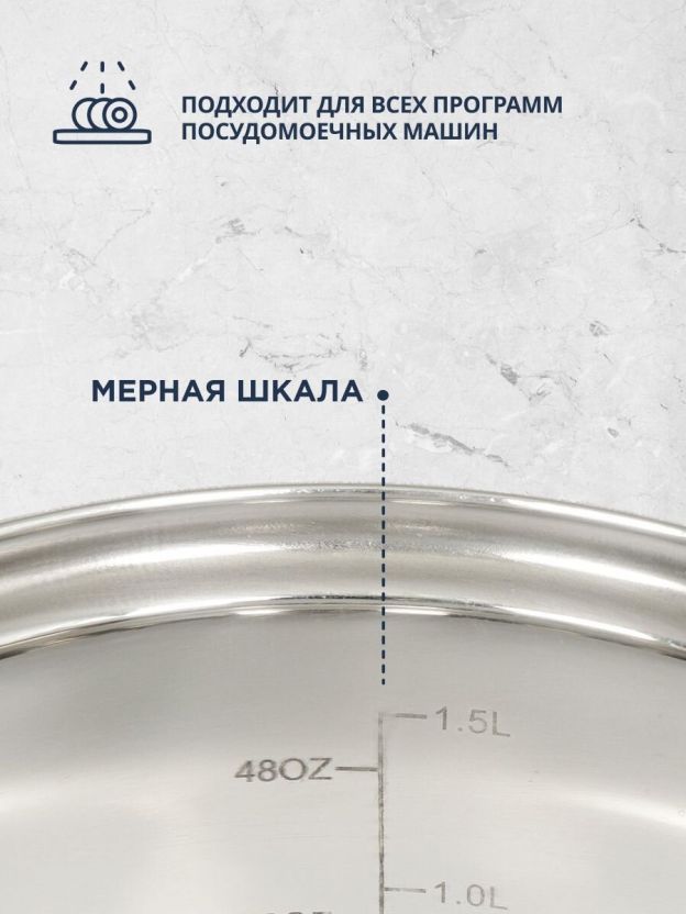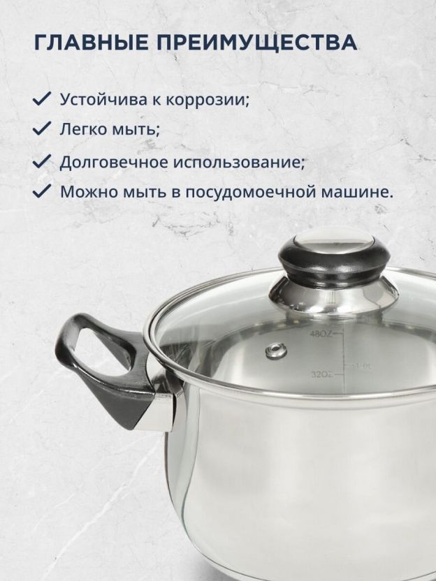 Кастрюля из нержавеющей стали 1.9 л с мерной шкалой и стеклянной крышкой — идеальный выбор для дома и дачи: удобно готовить суп, макароны, кашу, не боясь пригорания и перелива.