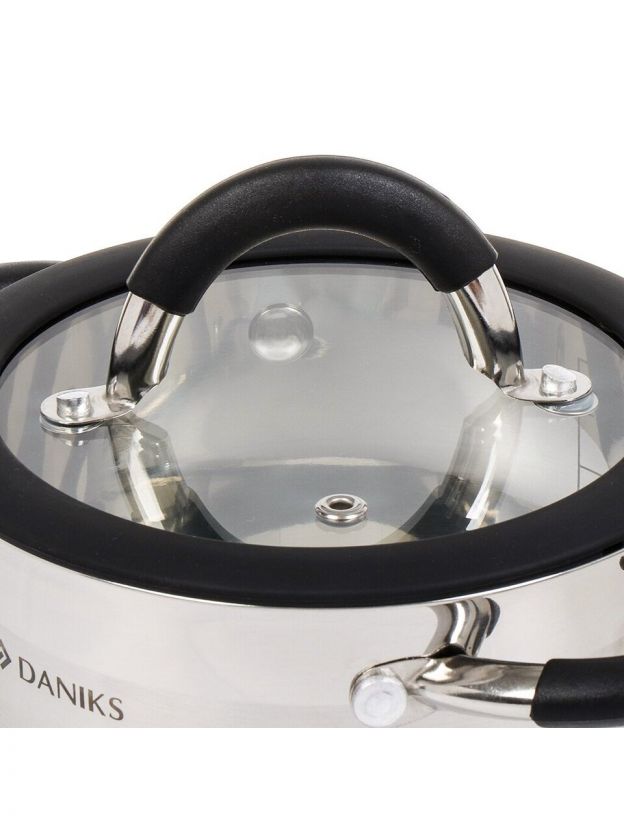 Кастрюля Daniks Орландо 1.9 л из нержавеющей стали с капсульным дном — универсальное решение для индукционных и газовых плит. Удобная мерная шкала, стеклянная крышка и силиконовые ручки для комфортной готовки дома и на даче.