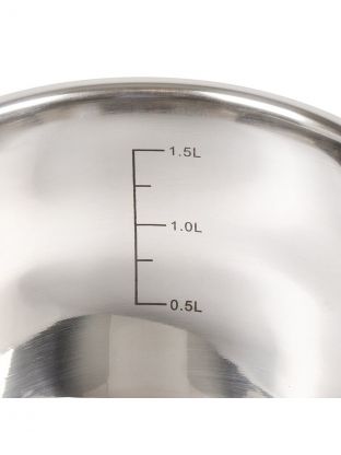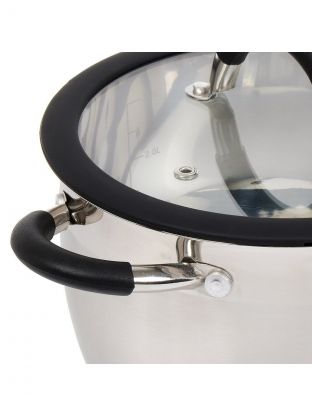 Объём — 1.9 л, диаметр дна — 12 см, диаметр кастрюли — 16 см, высота без крышки — 11 см, вес — 0.8 кг. Крышка — стеклянная, ручки — силиконовые.