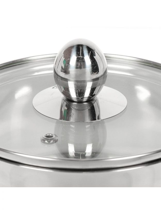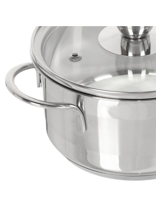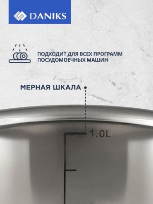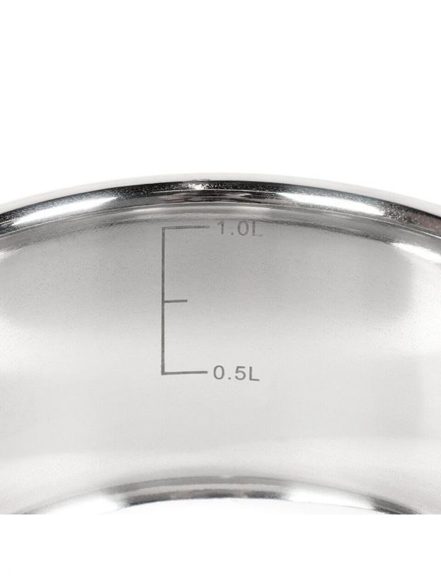 - Компактность и прочность: объём 1 л, диаметр 14 см, сталь марки 201, крышка из закалённого стекла с клапаном