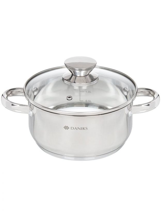 Кастрюля Daniks Оптима 2.2 л из нержавеющей стали с капсульным дном и стеклянной крышкой: быстрый нагрев, универсальность для всех плит, оптимальный объём для семьи.