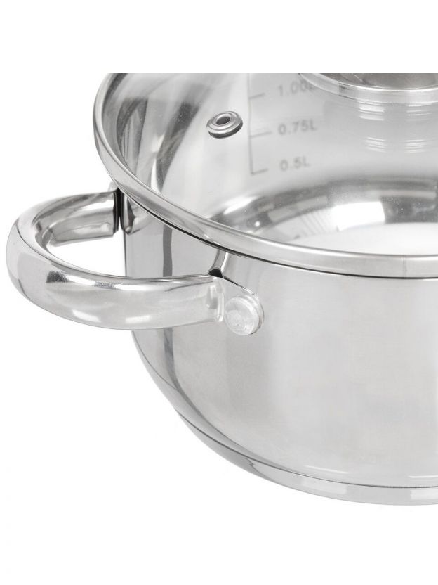 Кастрюля из нержавеющей стали Daniks Оптима 2.2 л — выбор для тех, кто ищет универсальную посуду для разных плит, включая индукционные. Благодаря капсульному дну (толщина 3 мм) тепло распределяется равномерно, что предотвращает пригорание и ускоряет приготовление. Стеклянная крышка с выпускным клапаном позволяет контролировать процесс без потери пара, а мерная шкала внутри облегчает дозировку ингредиентов.