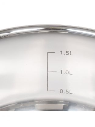 Диаметр кастрюли — 18 см, диаметр дна — 15.5 см, высота без крышки — 9 см, с крышкой — 14 см. Объём — 2.2 литра.