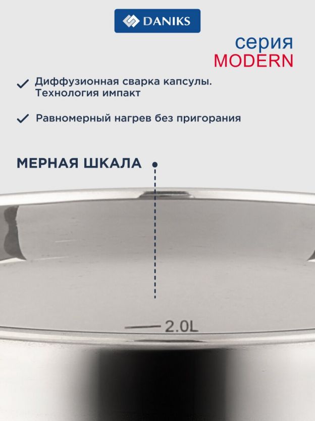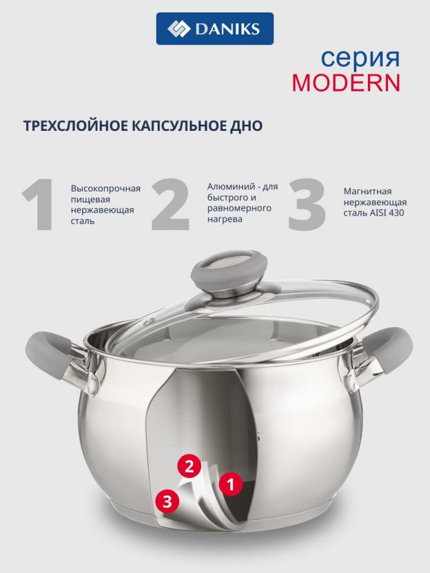Кастрюля Daniks Модерн серый 2.9 л — идеальное решение для индукционных плит: долговечная нержавеющая сталь, стеклянная крышка, мерная шкала и универсальный размер для дома и дачи.