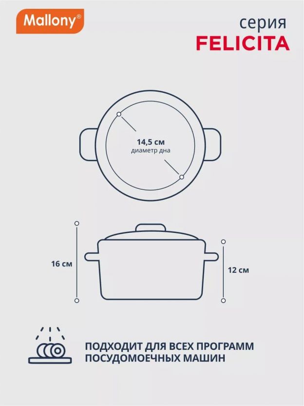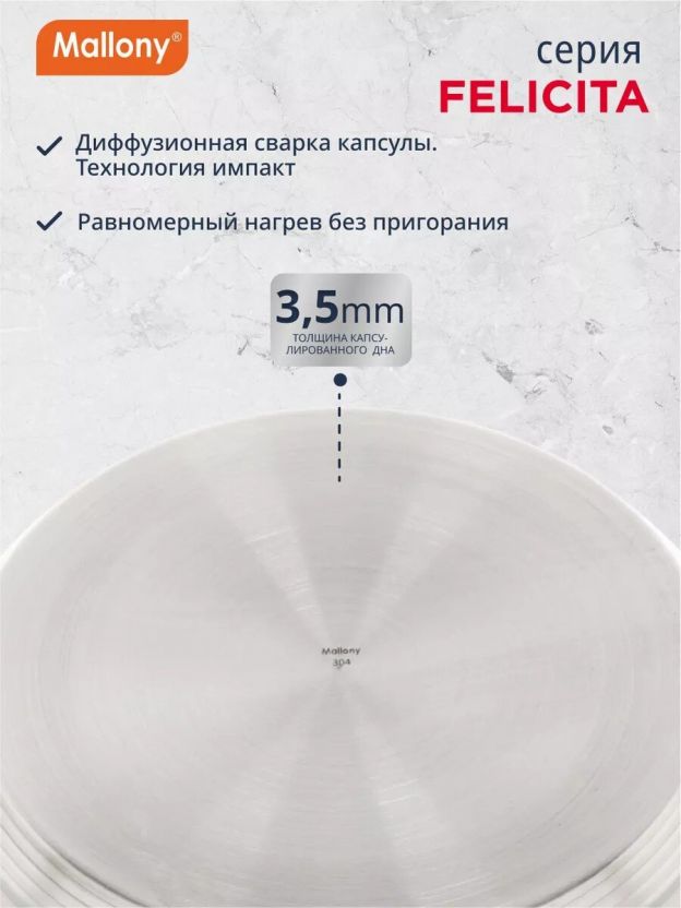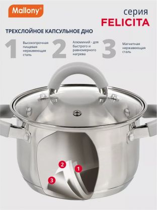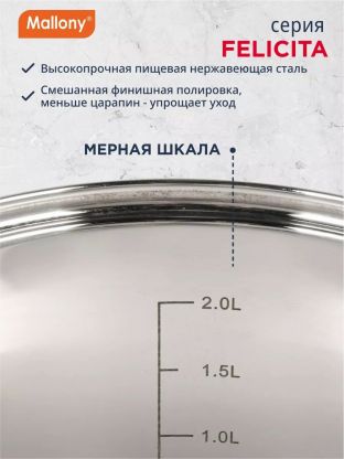 Выберите кастрюлю Mallony Felicit_ 2.9 л — выгодное решение для дома, дачи или в подарок. Закажите сейчас и получите надежную посуду с гарантией производителя 12 месяцев.
