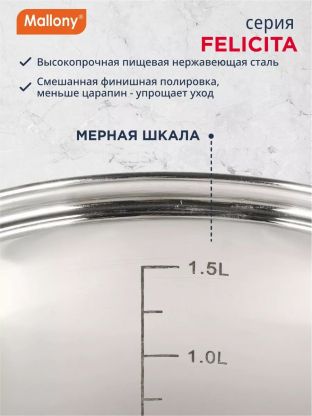 Кастрюля Mallony Felicit_ 2 л — универсальное решение для индукции и любых плит: нержавеющая сталь, силиконовые ручки, стеклянная крышка, выгодная цена.