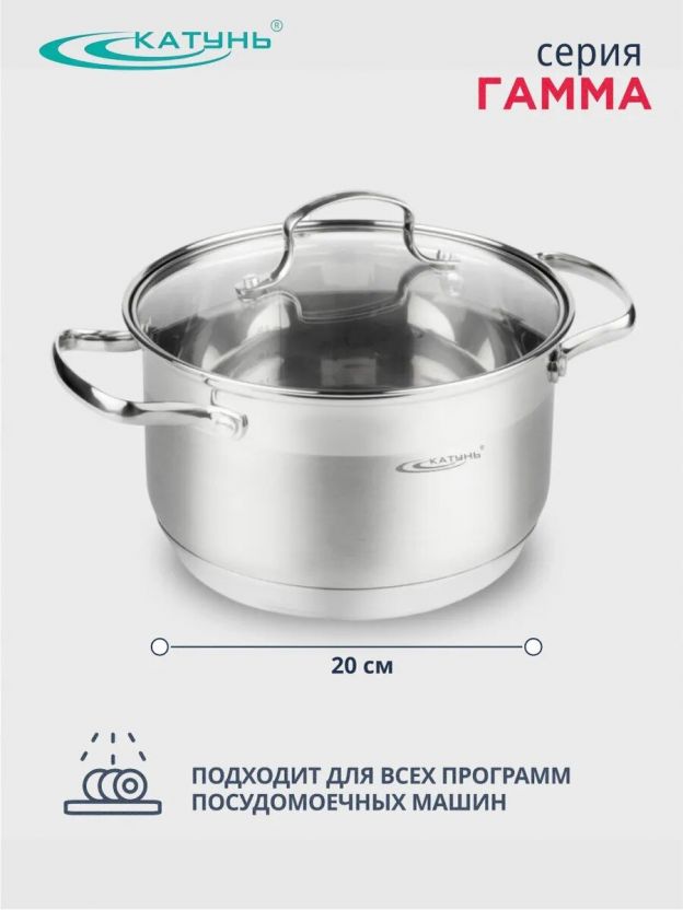 Кастрюля нержавеющая сталь, 3.4 л, крышка стекло, Катунь, Гамма, КТ20-D-20, индукция