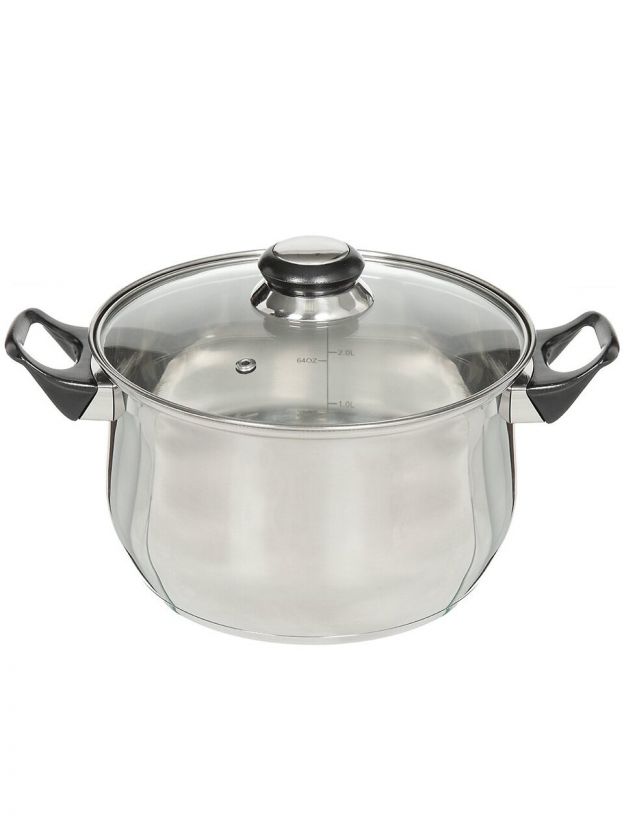 Кастрюля из нержавеющей стали 3.8 л с мерной шкалой и стеклянной крышкой — оптимальный выбор для семьи: удобно готовить суп, макароны, кашу дома и на даче.