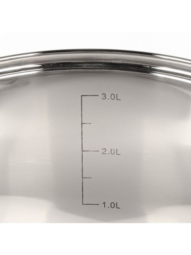 Объем — 3,9 литра, диаметр по верху — 20 см, высота с крышкой — 17 см, вес — 1,08 кг. Подходит для приготовления супов, каш, пельменей и других блюд.